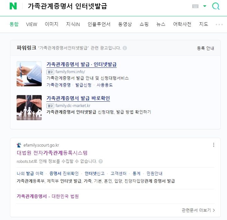 먼저 가족관계증명서는 '가족관계증명서 인터넷 방급'이라고 인터넷에 치셔서 검색합니다.