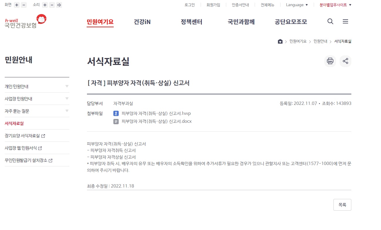 왼쪽 상단에 돋보기에서 '피부양자 자격 '라고 누르시면 피부양자 자격(취득·상실) 신고서를 발견하실 수 있습니다.