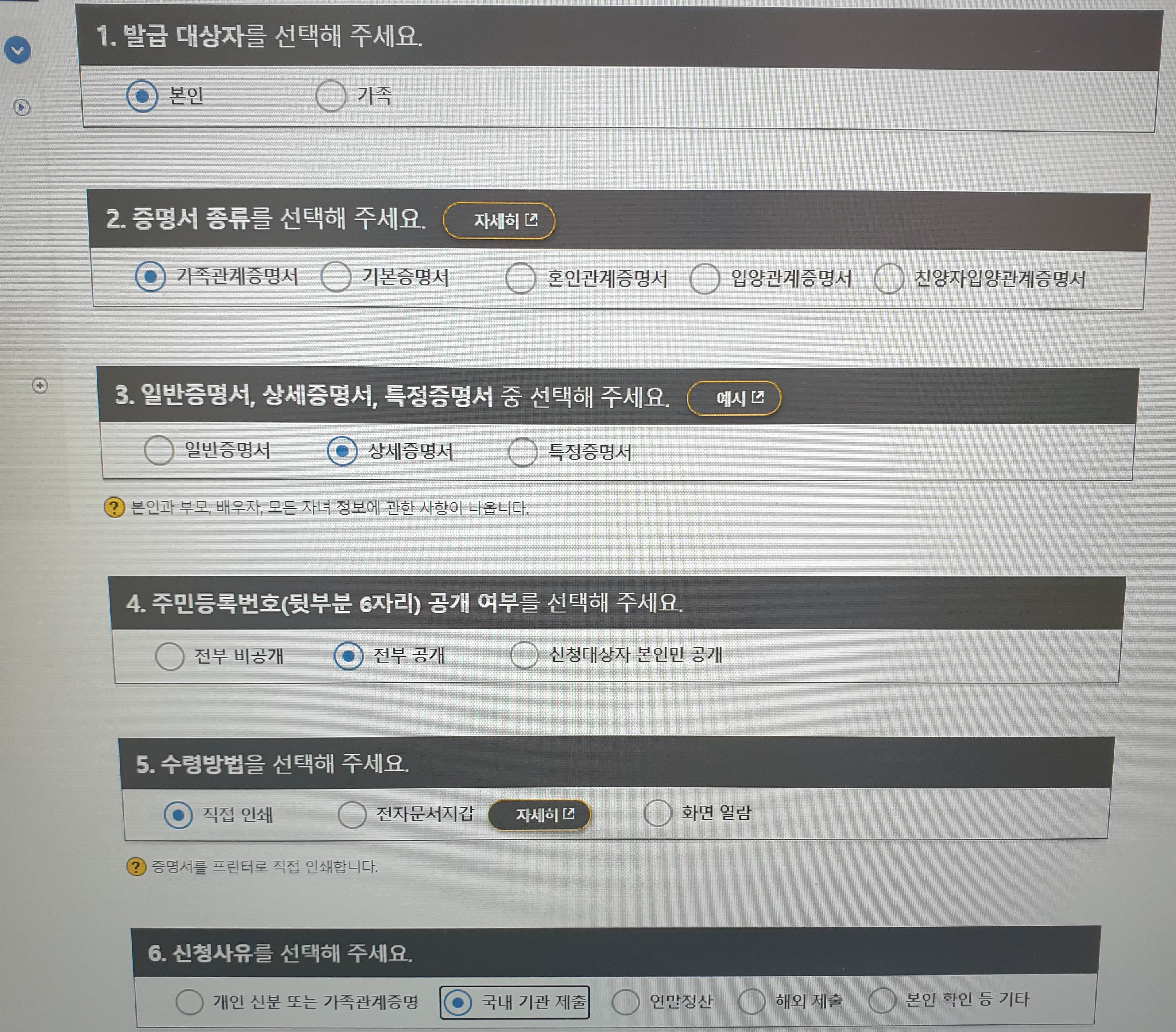 상세증명서가 필요해서 3번에 상세증명서선택, 민증 뒷번호까지 있어야 등록이 되기 때문에 전부공개를 선택했습니다.