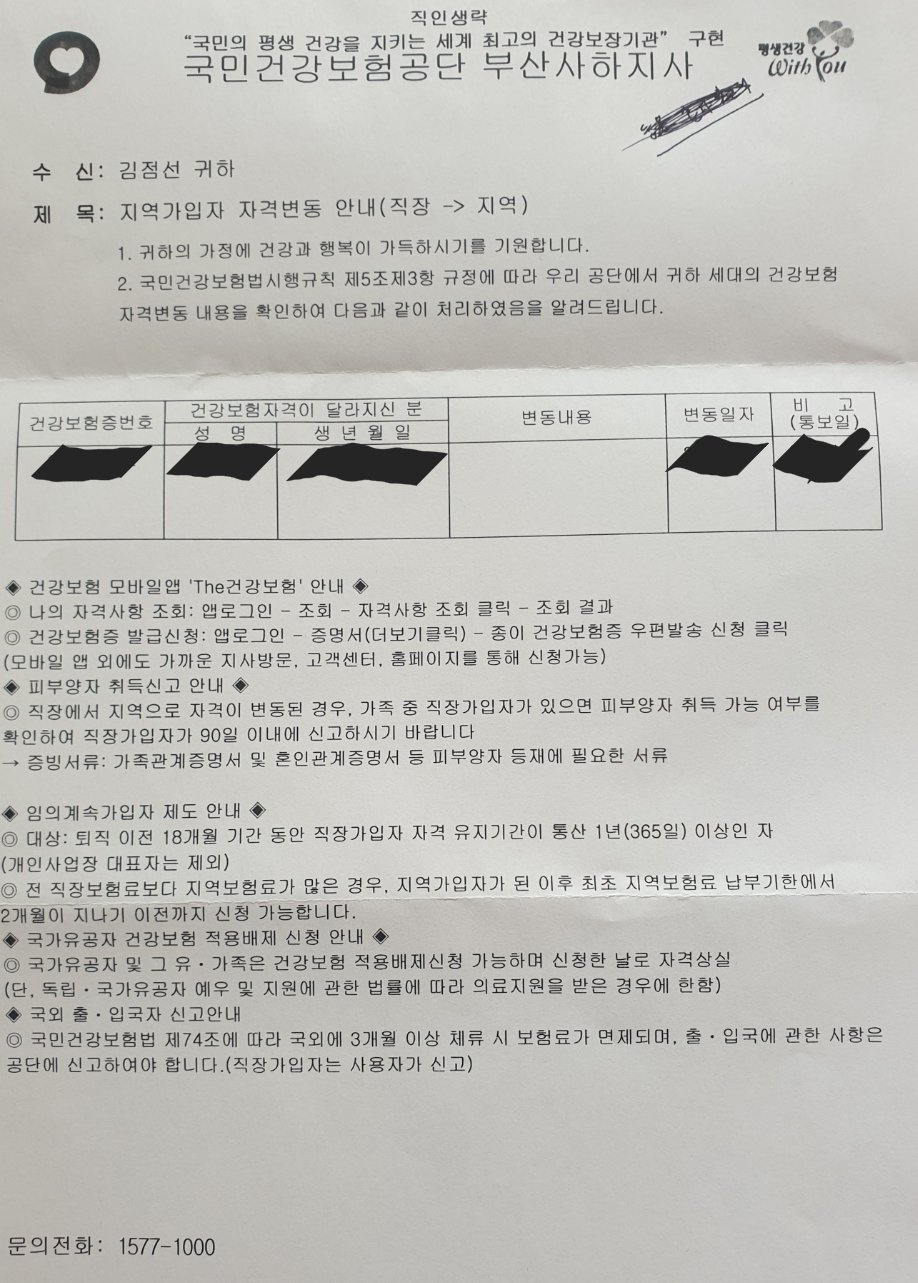 1월 15일에 집에 건강보험공단에서 직장가입자에서 지역가입자로 바뀌었다고 이렇게 우편이 왔습니다.